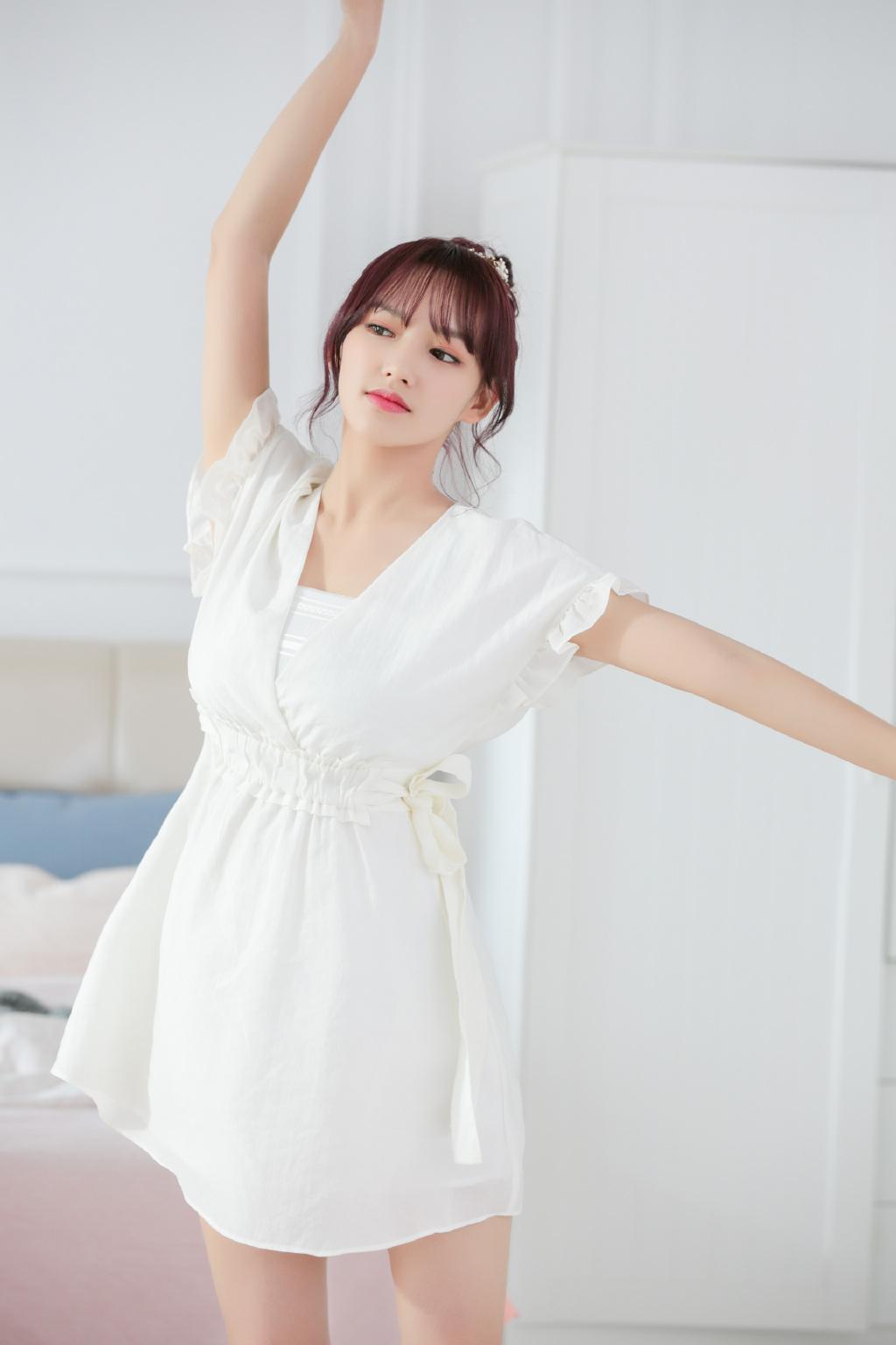 穿着白色V领连衣裙的她,真真是肤若凝脂肤白胜雪呀!而且又有刘海的加持看起来更加的清纯,极具少女感了,与此同时,这个连衣裙的设置也是很巧妙的,V领的设置刚好衬托出天鹅颈有木有!