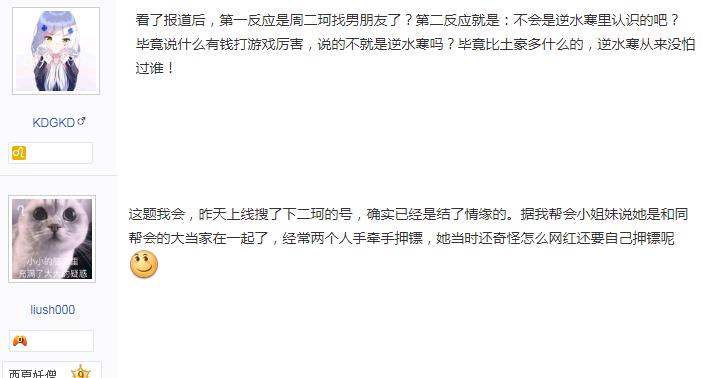 接着就有娱乐圈的八卦大号发出爆料消息,字里行间直指周二珂的男友是在逆水寒中认识的土豪哥,并且拿王思聪和秦奋做掩护。说起逆水寒这款游戏,有许多知名大佬都曾经玩过这款游戏,王思聪、秦奋、五五开、小楼等等,二珂当年也是和他们一起在逆水寒里一起玩的。但是小编认为应该不可能是王校长和秦奋,毕竟个子高这一条,他们就被PASS了。