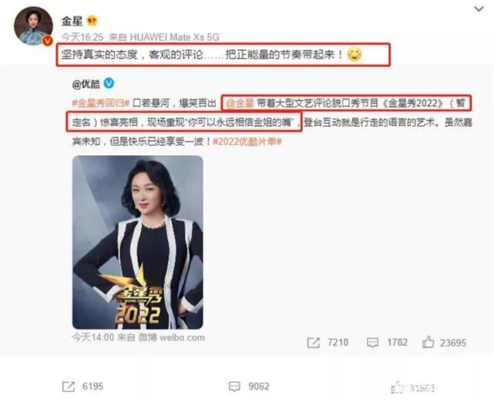 酷发微博,官宣《金星秀2022》,将惊喜重现为你可以永远相信金姐的嘴。金星转发微博,写道:坚持真实的态度,客观的评论……带上正能量的节奏!可见,憋了4年,金姐很有话要说!