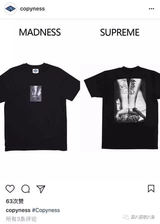 说回抄袭的事儿哈,INS上有网友为了嘲讽这事儿,做了两件T恤:copyness和madness