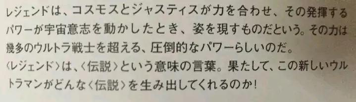 登场于"宇宙中两大伟大的力量相遇之时,在其光芒中会展露其真正的样子"这个自然宇宙人加西星人的古老传说中的战士。正如其"传说"的称号,拥有为保护所有的生命的强壮又无敌的力量。用极光之力承受再次释放的清除球并将其推回后,释放放出全身的能量的宇宙最强的技能火花传说,破坏了基伽恩多拉,保护了地球。