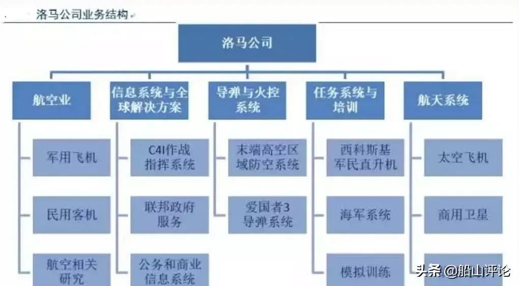 五角大楼每年采购预算三分之一的订货都由洛马负责,目前洛马销售的防务产品占据着世界防务市场的40%,其产品不仅范围涵盖军用飞机(战斗机、运输机等)、直升机、水面舰艇、弹道导弹、反导系统、雷达、卫星、载人飞船、精确制导武器等多个领域,而且均处于各个领域的最前沿水平。