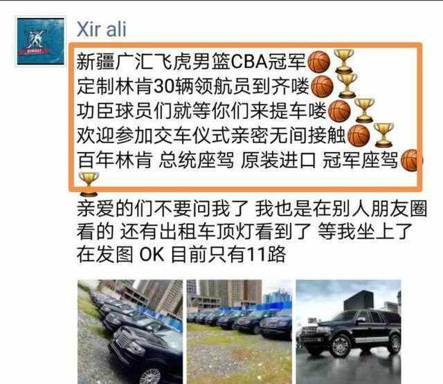 西热力江发布配图微信朋友圈称:“新疆广汇男篮CBA总冠军,定制30辆林肯领航员到齐喽,功臣球员们就等你们来提车喽,欢迎参加交车仪式亲密无间接触,百年林肯,总统座驾,原装进口,冠军座驾”,同时西热力江还配发了五张车辆到货现场图,并称将在近期举办提车仪式。