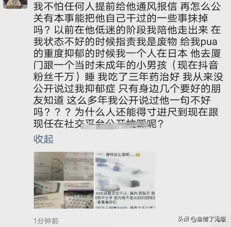 后续又爆料称:有本事把他自己干过的一些事抹掉,他低迷期是我陪他度过,结果我状态不好时却被他骂“废物”,被PUA致重度抑郁,一个人在日本,他在厦门跟一个未成年小男孩发生亲密关系。