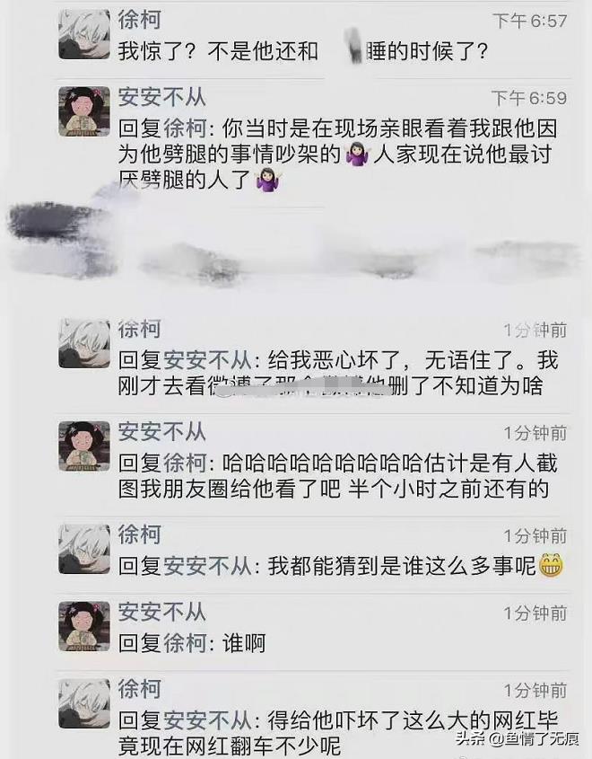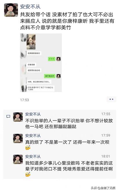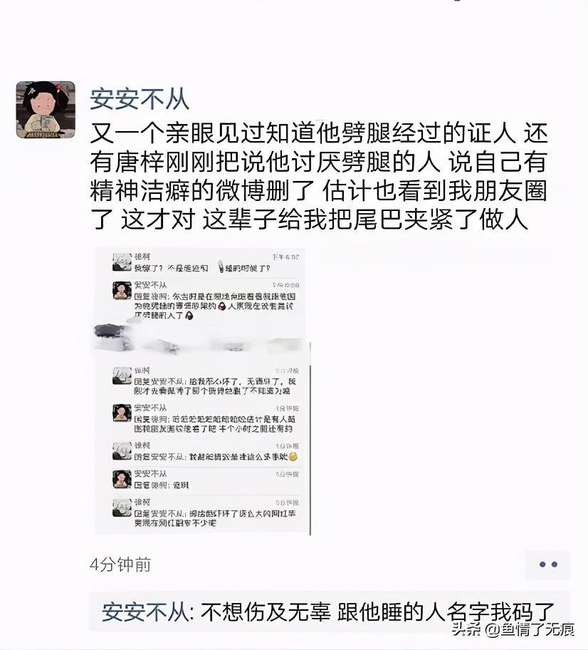 这位“安安不从”先是晒出自己与唐梓的聊天记录证明自己身份,后是直接曝出唐梓劈腿,还在社交网站上立有精神洁癖人设。