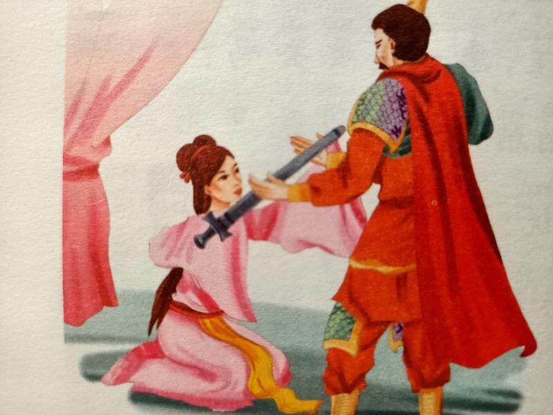 这时,女英也来了。她看起来不像姐姐那般担心,而是满脸笑容。女英将自己为舜挑选的最好的一把宝剑递过去,大声说:“大王,您就放心去吧!那九条恶龙一定不是您的对手!至于家里,我和姐姐会照顾好的!”