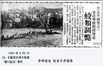 3、参观龙骨:当时的伪营口第六警察署将龙骨运至西海关码头附近空地陈列数日,《盛京时报》派人采访,称为“营川坠龙”等,图文并茂,轰动一时。观者络绎不绝,导致去营口的火车票一时涨价。骨架保存在营口一个师范学校做标本,后因战争时期社会混乱,下落不明。