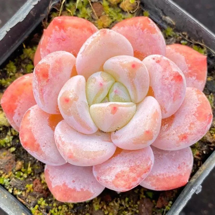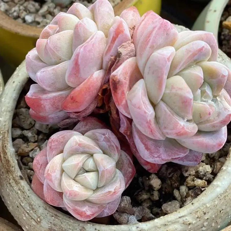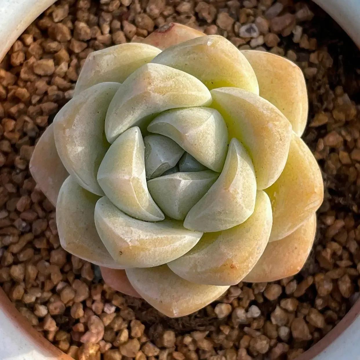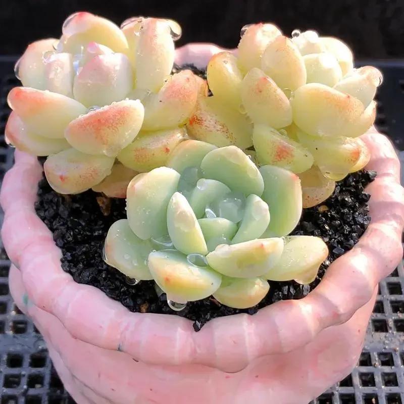 冰玉属于雪莲与厚叶月影的杂交品种,它的叶片肥厚多姿多呈现倒卵形,叶背呈三角状凸起,龙脊线较为明显,披有一层厚厚的白霜。平常状态下叶色多为白绿,一旦长出状态就会变成橙红,通透感特别强,整体具有较高的观赏价值。