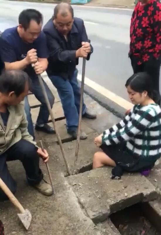一女子边走路,边玩手机一不小心脚卡沟里去了