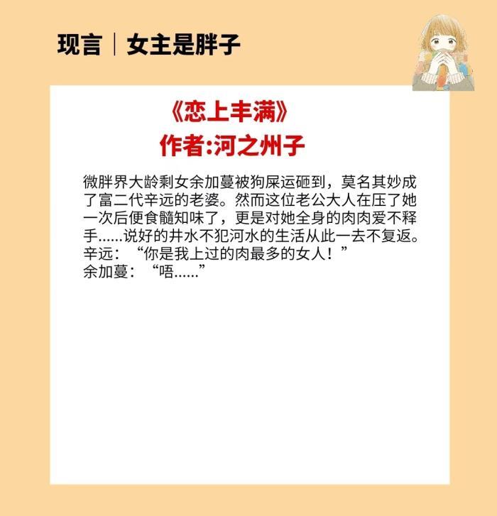 大家好,我是涵涵,本期分享4本女主是胖子的现言宠文,女主娇憨可爱小胖妞,总让他不自觉宠溺!
