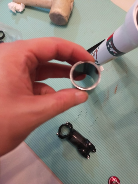 然后我们安装把立,这里有的车友为了省事,采用加入垫片不截管。其实截管也是根据自身身高臂长,上身幅度等一系列参数作为前提来调节的。还有组车用途,选择把立长短,角度。等等。。。在这就不细说了。