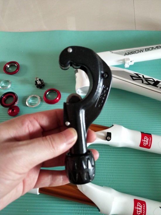 在安装前叉时,我们需要一个截管工具,来给多余的前叉进行截管。这个小工具同时也可以给把横,座管进行截管。相当方便。使用时需固定在需要截断的部位,拧紧限位螺丝,拧一到两圈,在继续拧紧限位螺丝,循环操作。直到管壁脱落。