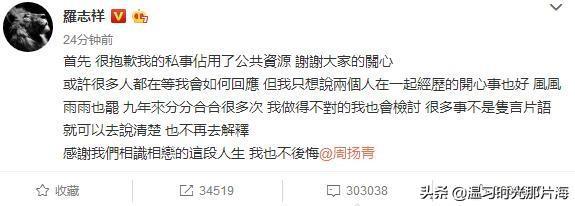 同时,今天罗志祥疯狂上线,自己吃自己瓜,网友评价“他急了他急了他急了”,不得不说,他需要一个如《完美关系》中卫哲这样的专业公关人来处理此事啊,事业危机告急,中午12点多,他终于回应了此事,发文:“首先很抱歉我的私事占用了公共资源谢谢大家的关心,或许很多人都在等我会如何响应,但我只想说两个人在一起经历的开心事也好,风风雨雨也罢,九年来分分合合很多次,我做得不对的我也会检讨,很多事不是只言片语就可以去说清楚,也不再去解释感谢我们相识相恋的这段人生我也不后悔”并艾特周扬青。