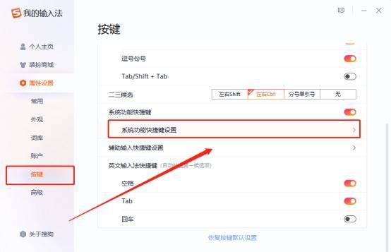 2、设置页面点击“按键”>“系统功能快捷键设置”;