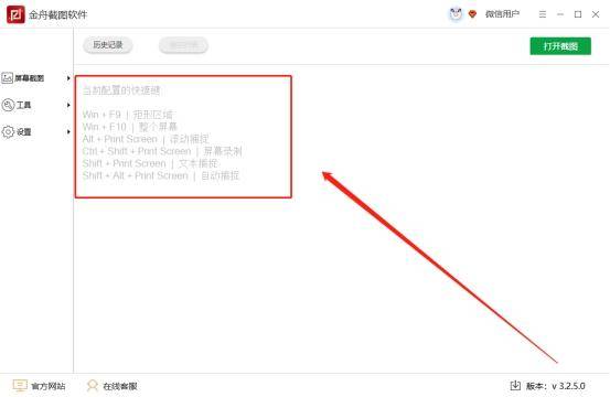 1、打开电脑桌面的金舟截图软件,进入软件页面会有提示,截图快捷键的使用提示,也可以点击“设置”进行个性化的调整;