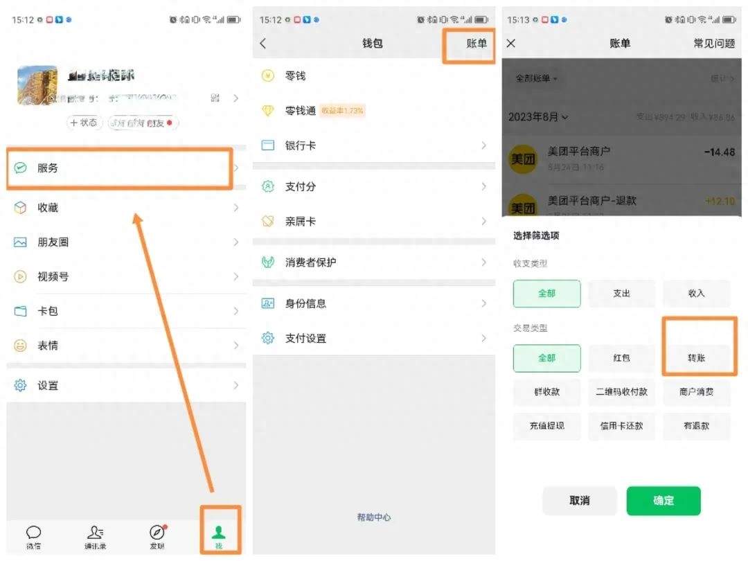 下面来看看如何操作,首先进入微信【我】-【服务】-【钱包】-【账单】。