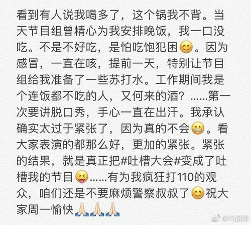 马景涛随后发了一篇800字的长文,真情实感又有理有据地阐述了自己表现失常的原因,最后还深刻地反省和道歉,大致意思就是自己理解错误,但是连饭都没吃更别提喝酒了。