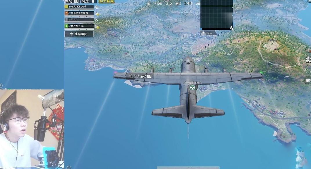 很快游戏的等待时间结束,小刘最英俊和三个队友,站在一架飞机上开始加载界面。而我们也可以看到,他们的服装各有不同,也各自显露着王者风范。