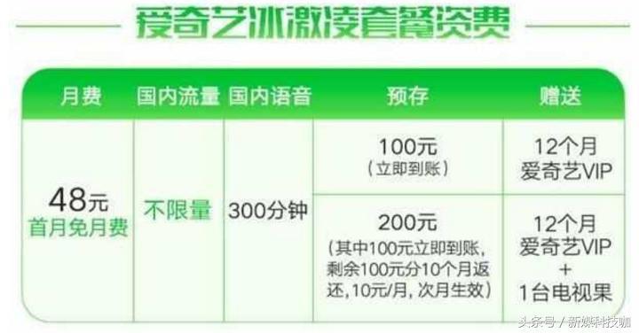 月费48元,首月免月费,国内流量不限量,国内语音300分钟,预存100元立即到账,赠送12个月爱奇艺VIP。