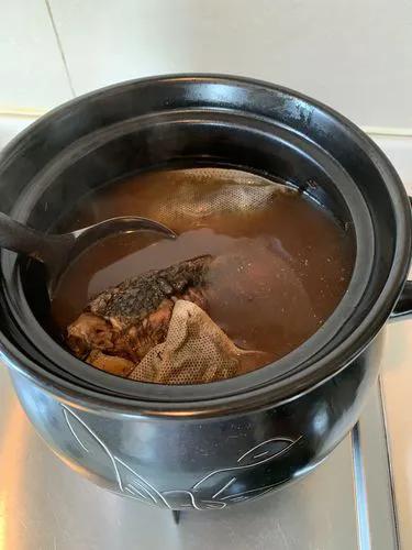 4.汤袋洗净(最好再用开水烫一下),然后把绵茵陈放入汤袋里,绑紧袋口和鲫鱼一起放入砂锅内。