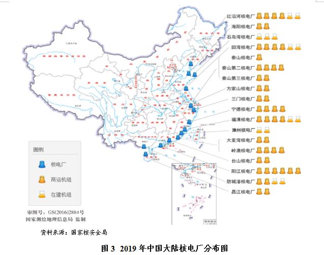 截至2019年12月31日,我国运行核电机组共47台,装机容量为48751.16MWe。其分布在全国各地: