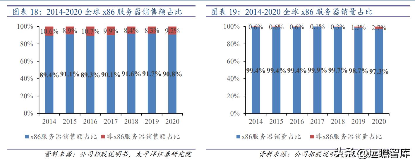 在服务器领域,x86架构更是凭借先发优势份额遥遥领先。由于x86处理器起步较早,生态环境较其他处理器具有明显优势,因此应用x86处理器的服务器销售额占全部服务器销售额的比例约91%,销售量占比超过97%,处理显著领先地位。