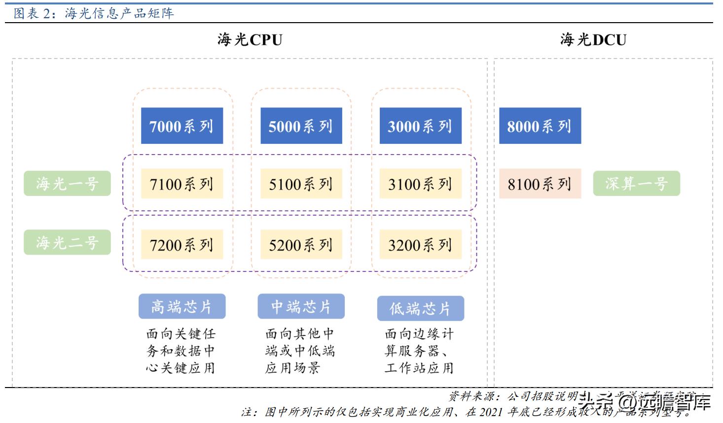 经过多年研发,公司形成了7000系列、5000系列、3000系列的高、中、低端CPU芯片,以及8000系列的DCU芯片。