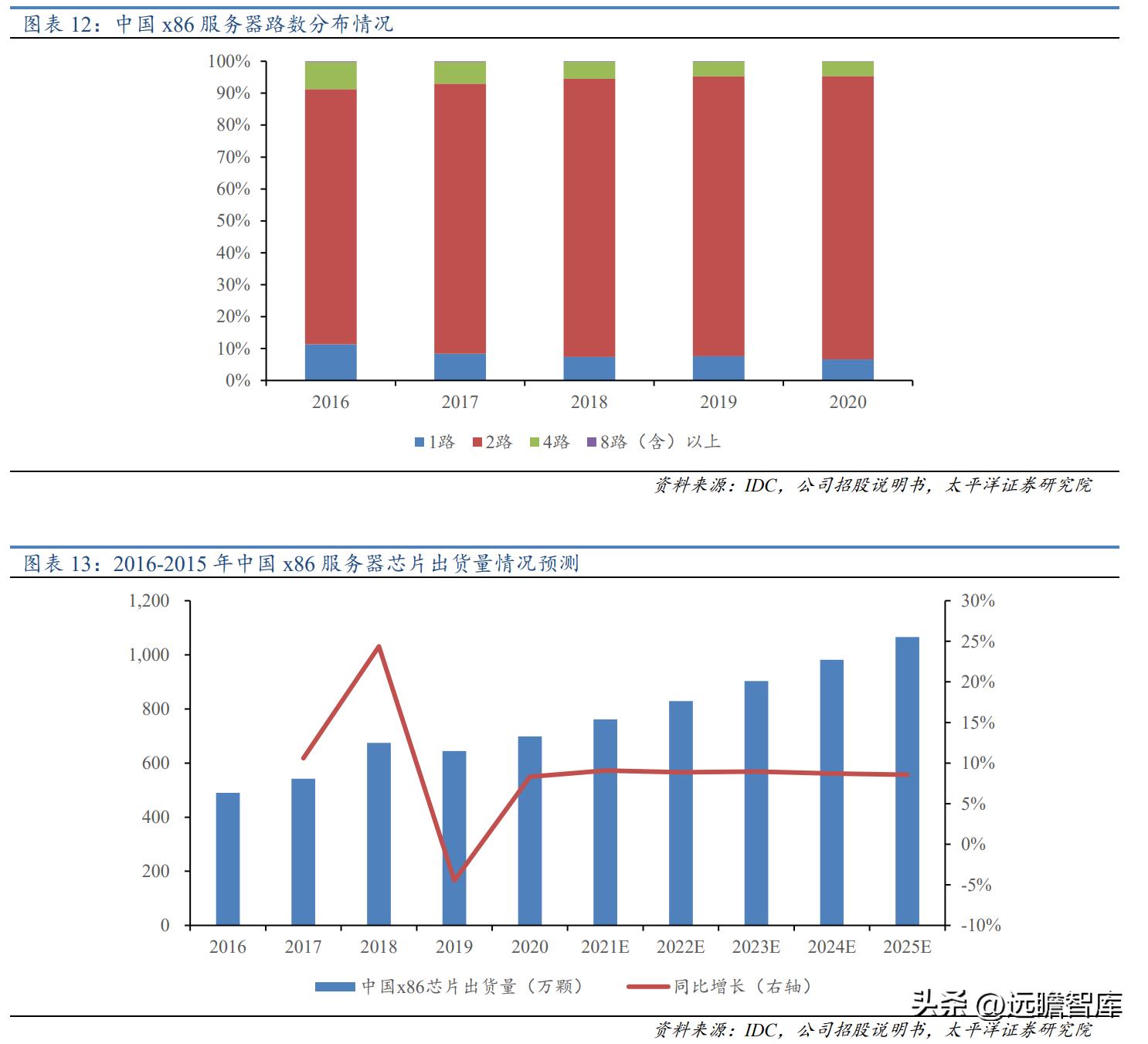 根据中国x86服务器市场出货量和路数分布情况进行推算,2020年中国x86 CPU芯片出货量为698.1万颗。假设2021年至2025年路数分布情况与2020年保持一致,则2021年芯片出货量将增长9.1%,2022年至2025年将保持9.0%左右的增长,预计在2025 年芯片可以达到1,066.2万颗,x86 CPU 芯片未来在我国仍会拥有广阔的市场空间。