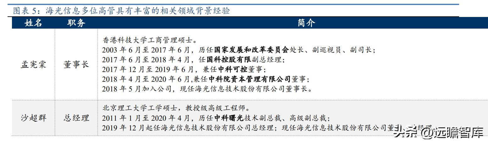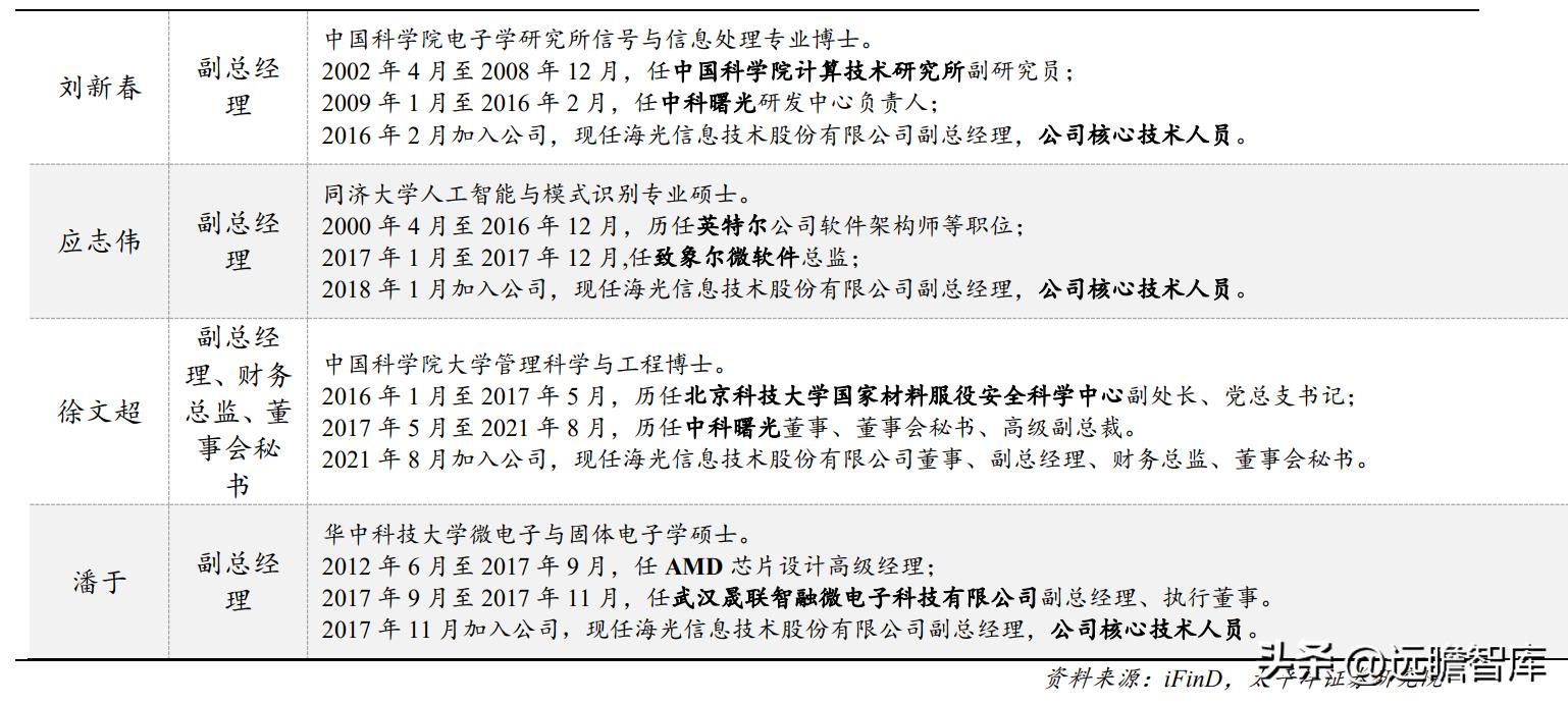 公司董事长孟宪棠先生有国家发改委、国科控股有限、中科院资本管理有限公司等任职经历。公司总经理沙超群、副总经理刘新春、徐文超等曾在股东中科曙光任职,中科曙光为中科院计算技术研究所旗下公司,具备雄厚的技术实力;公司副总经理应志伟、潘于曾就职于英特尔、AMD等行业巨头。这样一支经验丰富的高管团队是公司雄厚技术实力的重要保证。