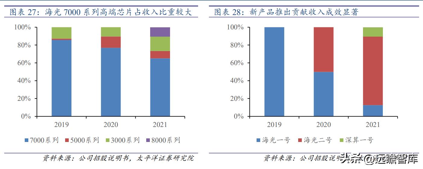 高端产品收入占比较高,新产品推出对收入贡献成效立竿见影。近3年公司7000系列的高端产品始终是收入的主要来源,分别占到营收比重85.70%、76.91%、65.01%。2020年以来随着海光二号量产、深算一号规模化出货,其营收占比迅速提升,产品更新换代在收入上的体现立竿见影。