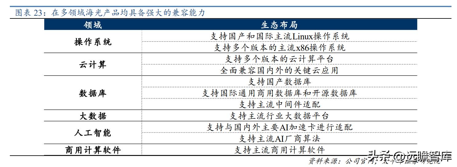 在多领域海光产品均具备强大的兼容能力。在操作系统、云计算、数据库、大数据、人工智能、商用计算机软件等多领域,海光均与国内外主流版本实现兼容,具备强大的生态能力。
