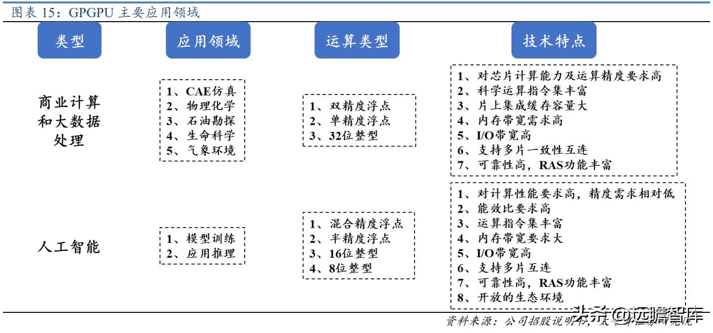 而随着人工智能相关技术的进步,应用场景将更加多元化,GPGPU通用性好和软件生态系统完善的优势会进一步展现出来,成为该领域的主流解决方案。GPGPU在我国人工智能芯片领域也将占据较大比例的市场份额,迎来增长机会。