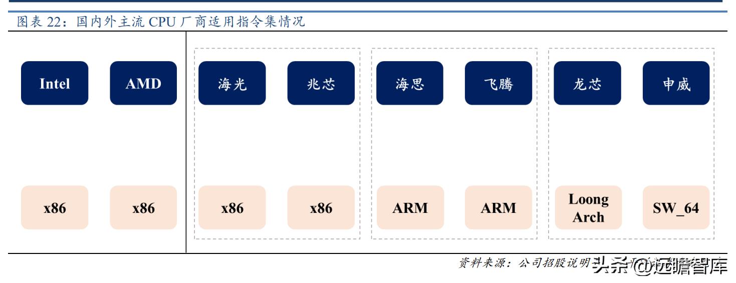 国际主流CPU厂商Intel与AMD均采用x86架构。由于产品定位和技术来源不同,国内处理器厂商选择了不同的技术路线,海光和上海兆芯的产品兼容x86指令集,具有良好的生态,且应用迁移转换成本低;海思半导体的鲲鹏处理器和天津飞腾处理器兼容ARM指令集,与众多软硬件厂商完成了大量适配工作;龙芯中科处理器采用LoongArch指令集,主要产品与服务涵盖处理器及配套芯片产品;成都申威处理器采用SW-64指令集,只要应用于服务器、桌面计算机等设备。