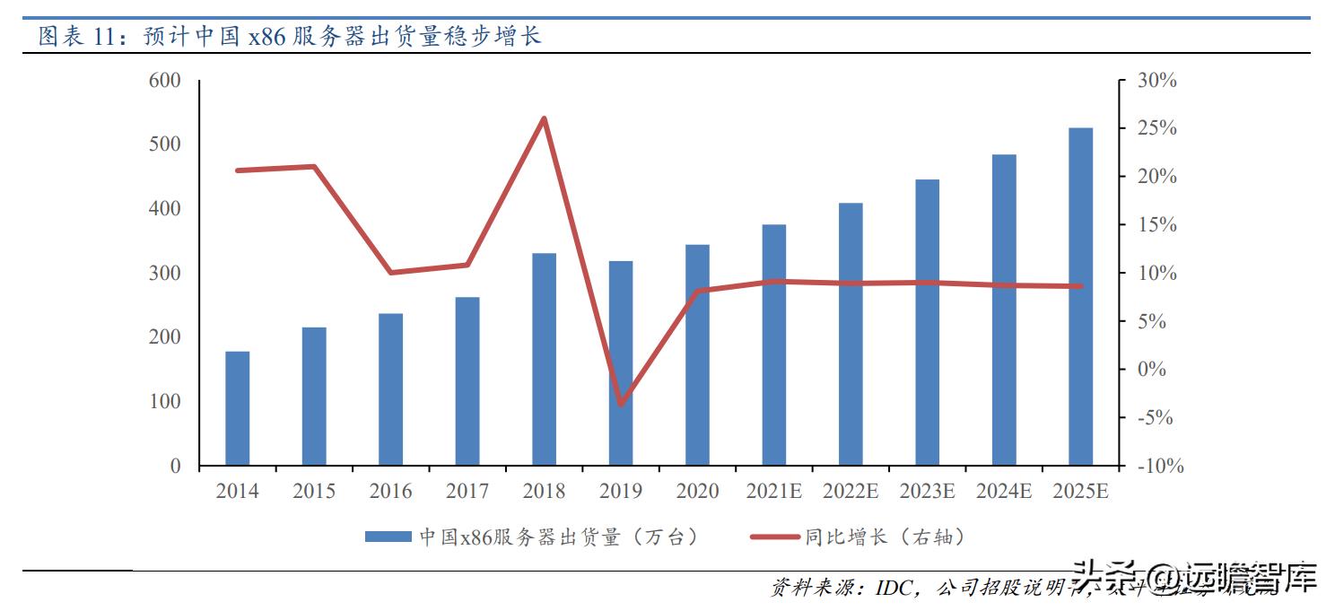 中国x86服务器出货量持续增长。根据IDC统计数据,2020年全年,中国x86服务器市场出货量为343.9万台,同比增长8.1%;市场规模为218.7亿美元,同比增长16.5%。随着下游市场需求回暖以及国家将加快5G、工业互联网、大数据中心、人工智能等七大领域新型基础设施的建设进度,中国x86服务器市场未来几年需求仍然会比较旺盛,在2021-2025年复合增长率将达到 8.8%。