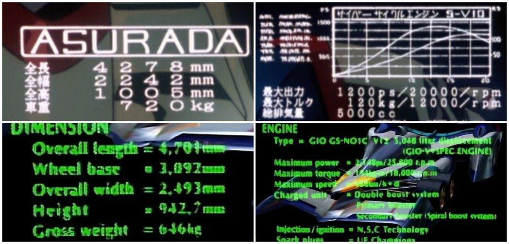 从动画里的片头与片尾的片段可以隐约推断出「阿斯拉」的性能,图片的上两张为初代阿斯拉GSX的数据,车身尺寸4,278x2,242x1,005mm、车重720kg。使用5.0升V10引擎,最大马力来到了1,200hp扭力则是120kgm,马力重量比来到夸张的0.6。而图片下两张则是后期的阿斯拉AKF-0,车身尺寸4,701x2,493x942.7mm,轴距3,092、车重646kg,最大输出2,148马力,极速可达680km/h,并且有双推进系统,马力重量比更是只有0.3,在现实世界几乎是不可能的事。
