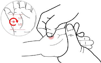 方法:位于手掌大鱼际平面,用指端揉。100-300次。