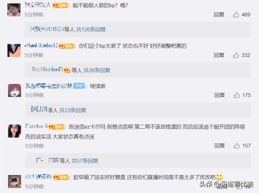 而在EDG官博下方的评论区,很多粉丝都认为BP的问题太大了,太装了,本来队员的状态也不好,结果BP还做成这样,怎么打得赢?而且特别迷信拿EZ扇子妈下路双人组,没有什么能开团的手段,真的需要好好调整了。也有粉丝认为队员们最近直播的时间太多了,感觉还是应该把时间多放在训练上面。