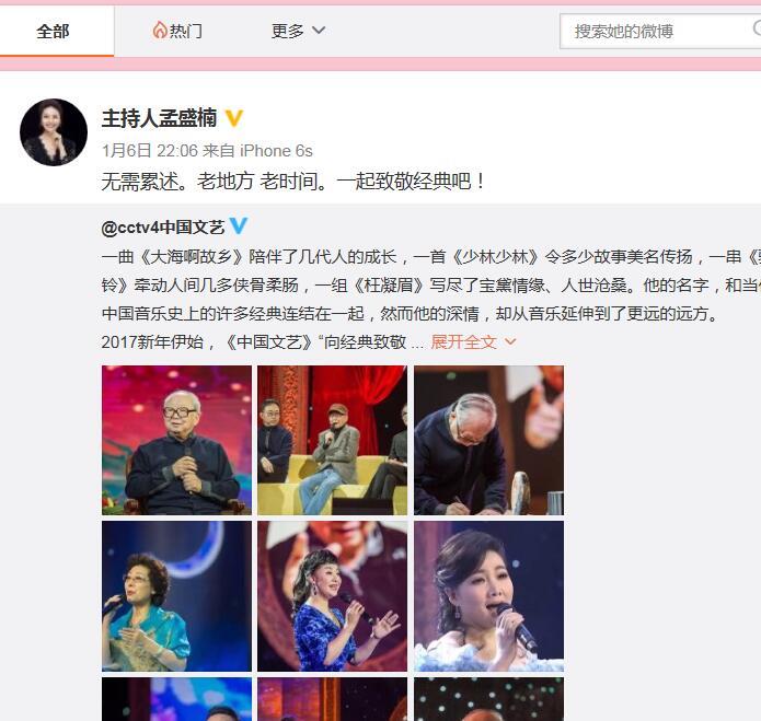 说完了三个好久不更新微博,再来看看春晚官微@的另两位主持人。@主持人孟盛楠 粉丝13万,1月6日,她更新过一条微博。