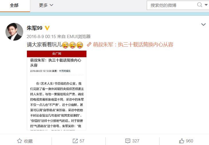 在春晚官微@的5个主持人微博中间,拥有241万粉丝的朱军去年8月份发了一条微博就至今再未更新过。