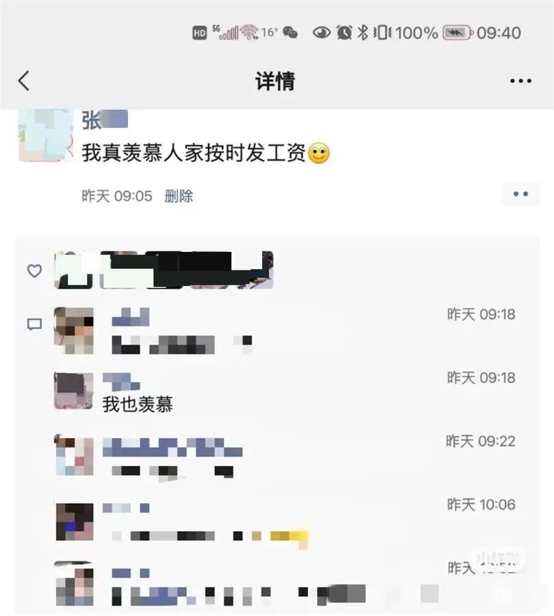 记者注意到,20日上午9时许,张女士发布了一条朋友圈:“我真羡慕人家按时发工资。”