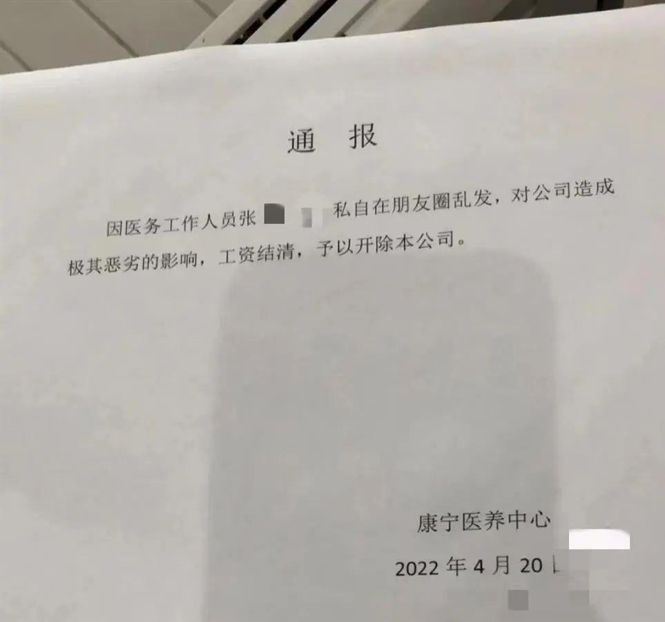 张女士展示的通报显示,因医务人员张某、某某私自在朋友圈乱发,对公司造成极其恶劣的影响,工资结清,予以开除本公司。底部公司署名为康宁医养中心。