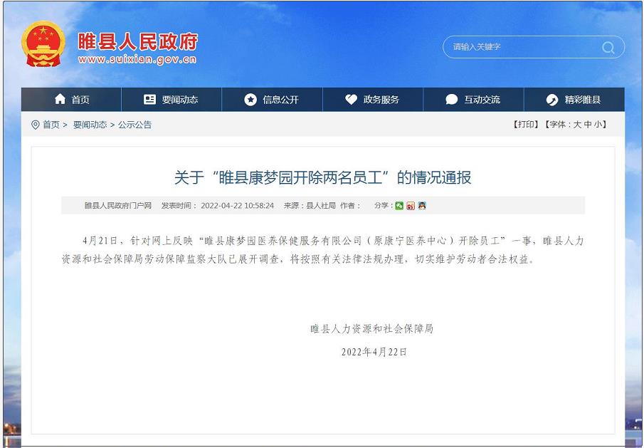 22日,河南睢县人力资源和社会保障局发布通报称,4月21日,针对网上反映“睢县康梦园医养保健服务有限公司(原康宁医养中心)开除员工”一事,睢县人力资源和社会保障局劳动保障监察大队已展开调查,将按照有关法律法规办理,切实维护劳动者合法权益。