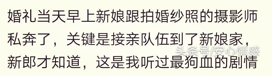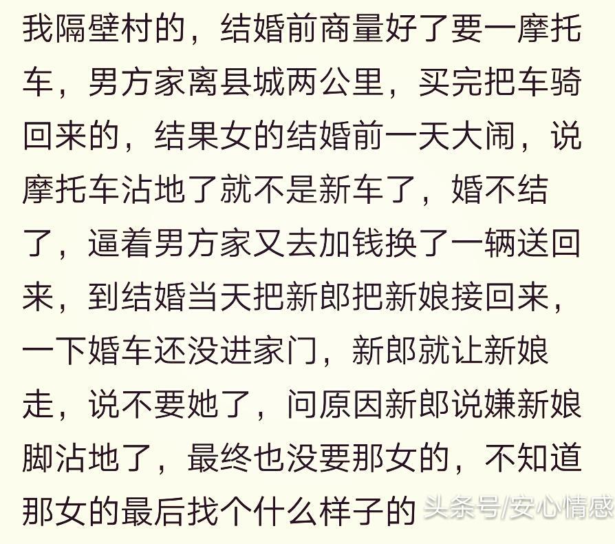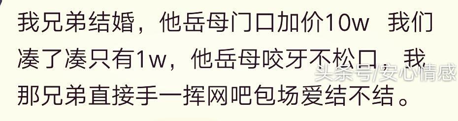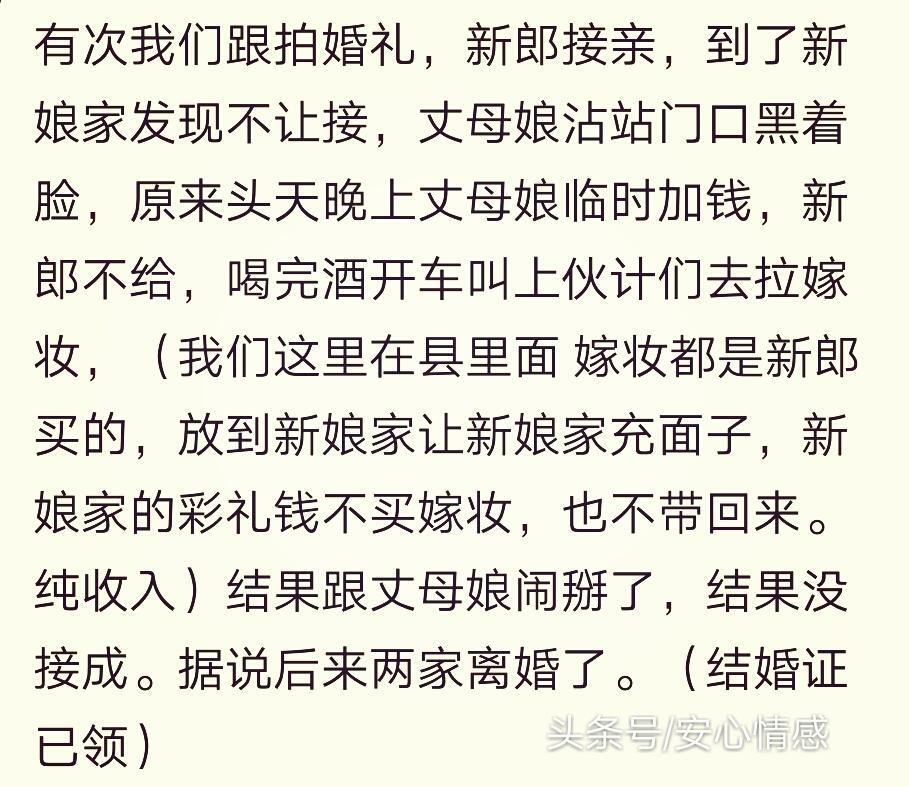 @2、大舅子结婚就是,我老丈人虽然不是什么大富大贵的家庭,但还算衣食无忧,而且主要我丈人很好说话,当时结婚什么东西都提前说好了,我妈做的媒人,结果结婚那天大舅子老婆就听她什么表妹的瞎逼逼,把我,大姨小姨,姐夫什么晾在外面,不开房门不让迎亲,最后大舅子火了,直接房门踹坏了,撂下一句,想结就结,不结拉到,最后女方才算消停,搞得现在大舅子对他老婆娘家那边人意见大的不得了,都不理他们!