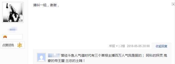 曾经斗鱼人气值时代有三个草根主播百万人气最高的:阿科的探灵、鬼豪的帝王蟹、还有一位就是兰总的土嗨!在这个号称斗鱼清流男人的戒撸所直播间里,主播兰总不仅是斗鱼早期第一个破百万人气的女主播,更是直接打败斗鱼三骚和韩国女主播的存在。不过后来不知什么原因退出直播了,有传言据说是去厂里打工去了,不过最近这位兰总她又回来了。
