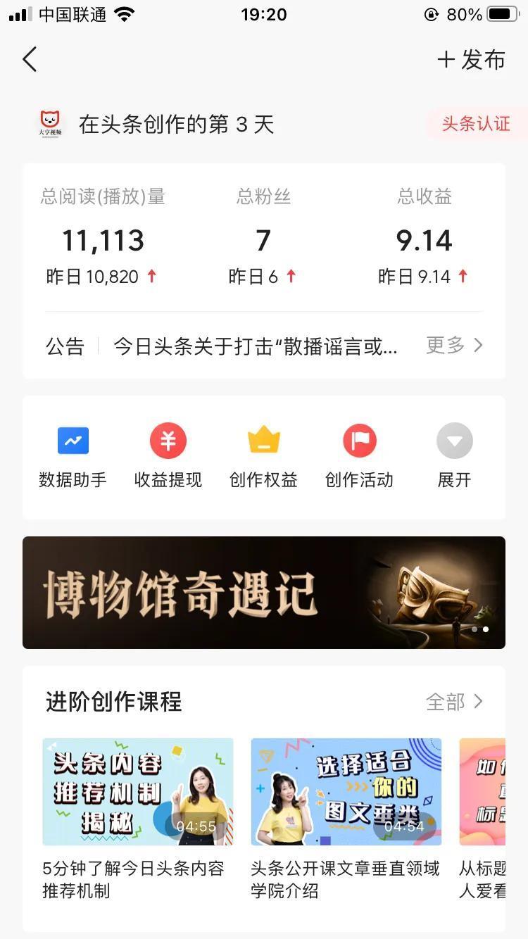 今天是来头条创作的第三天,让大家看看头条一万播放量的真实收益是多少,绝对真实,有想在头条创作的朋友可以一起交流。看看到时候会不会涨上去,我的就是1万播放量的收益就这点,有的人1万播放量可能会很多,但是我的就这点,这是怎么回事,是不是我的视频时间短,还是什么原因。明天我会继续更新,看看2万的时候,收益是多少,到10万播放量的时候,看看收益是多少,请大家继续关注,给我点个关注吧,手动打字,让够300字才能发表,写到这才200多字,第一次发表这样的真实文章,请大家给我个关注。1万播放量收益9块多,你觉得多,还是少呢?请在评论区互动留言。有没有跟我一起刚来头条创作的,大家一起来交流啊。点个关注吧!!