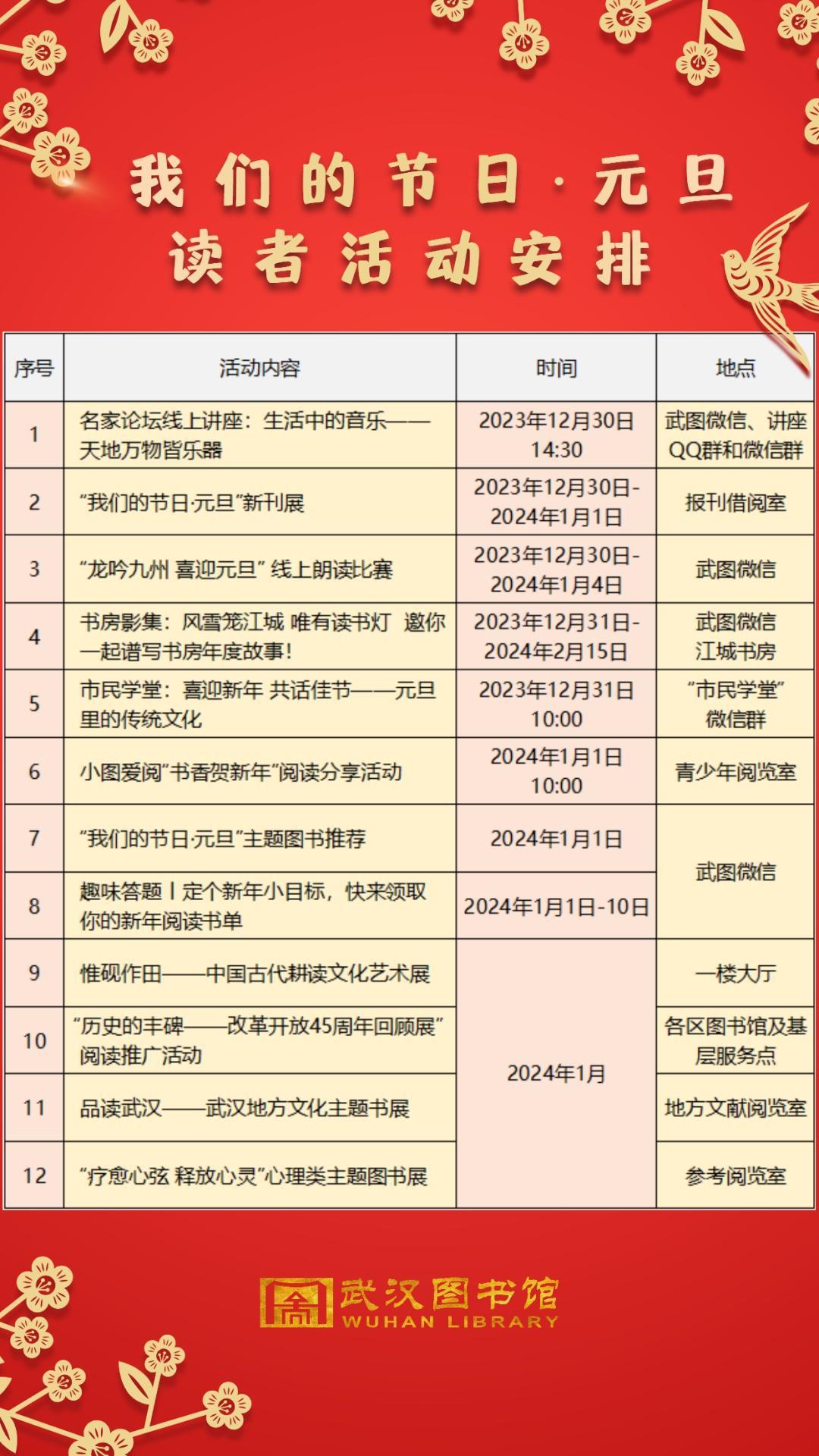 武汉图书馆2024年元旦假期开放时间及读者活动安排