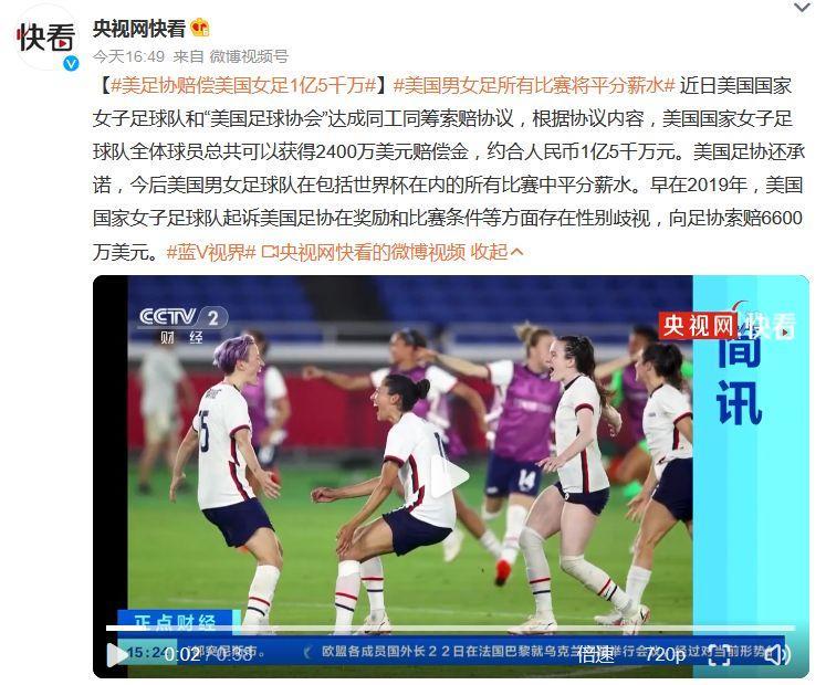 近日美国国家女子足球队和“美国足球协会”达成同工同筹索赔协议,根据协议内容,美国国家女子足球队全体球员总共可以获得2400万美元赔偿金,约合人民币1亿5千万元。美国足协还承诺,今后美国男女足球队在包括世界杯在内的所有比赛中平分薪水。早在2019年,美国国家女子足球队起诉美国足协在奖励和比赛条件等方面存在性别歧视,向足协索赔6600万美元。