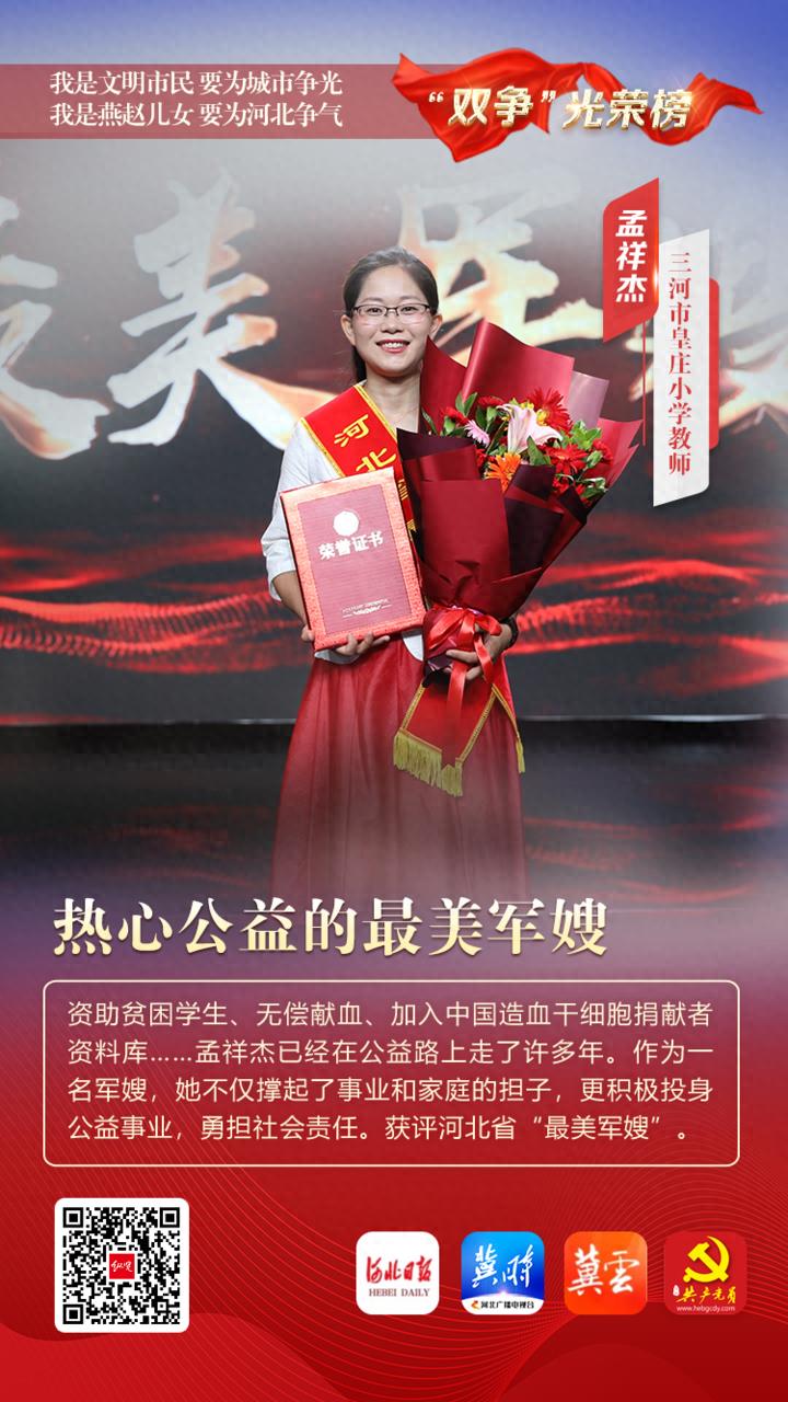 资助贫困学生、无偿献血、加入中国造血干细胞捐献者资料库……孟祥杰已经在公益路上走了许多年。作为一名军嫂,她不仅撑起了事业和家庭的担子,更积极投身公益事业,勇担社会责任。获评河北省“最美军嫂”。