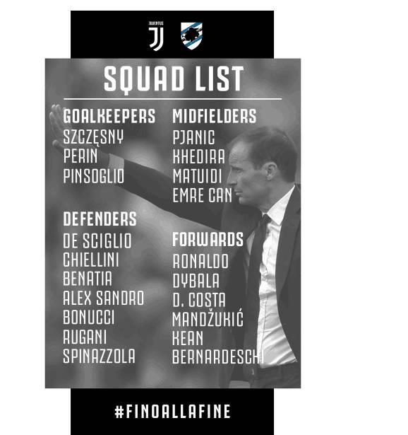 赛前,尤文官方公布了参加比赛的球员大名单。在这份名单里,阿莱格里派上了能够登场的所有球员。前锋方面,C罗、曼朱基奇、迪巴拉、道格拉斯-科斯塔、贝尔纳代斯基、小基恩领衔;中场方面,皮亚尼奇、赫迪拉、埃姆雷-詹、马图伊迪联袂;后卫方面,基耶利尼、博努奇、贝纳蒂亚、德西利奥、桑德罗、鲁加尼、斯皮纳佐拉压阵;门将方面,什琴斯尼、佩林、平索里奥镇守。可以看到,尤文主力基本上都在,这也能够显示球队取胜的决心。