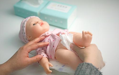 用温水清洗宝宝的私处。擦完之后,用纸巾或毛巾把小屁屁上的水分吸干,还可以让小屁屁晾一小会儿,让它更干爽。如果有需要,再在屁股上均匀地抹上护臀霜。最后,拿掉脏的尿不湿,把垫在腰后的干净新尿不湿展开,调整松紧带,捆在宝宝的腹部。脐带未脱落的时候,尿不湿不能遮住肚脐,后腰部要略高于前腹。